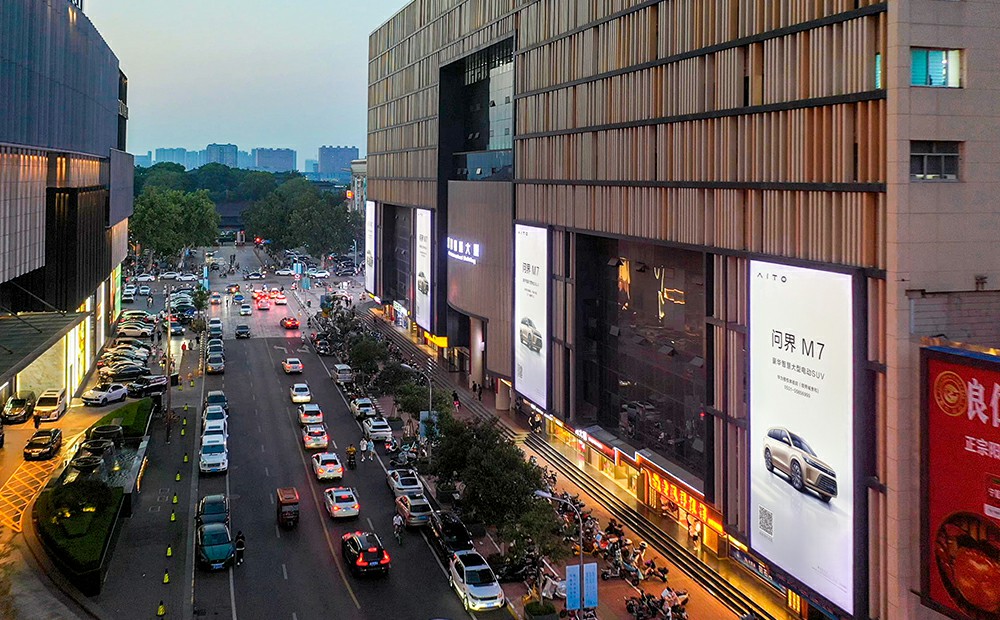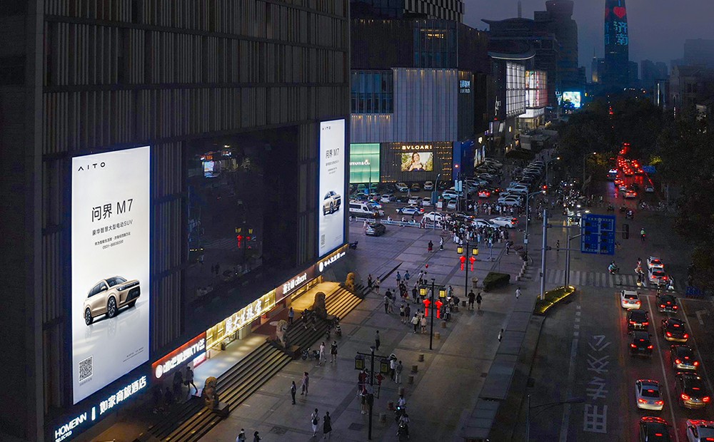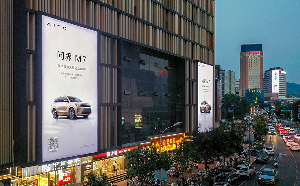 (華為問界M7投放濟南齊魯國際大廈戶外LED屏廣告)
