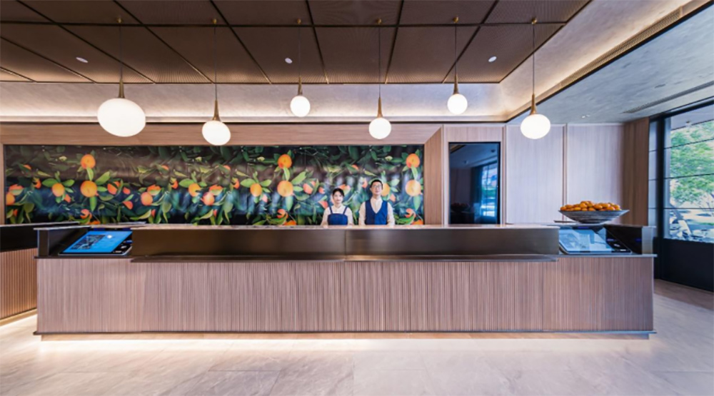 走進桔子濟南泉城廣場寬厚里酒店大堂,撲面而來的仿佛是加州橘子郡采擷而來的熱情與活力。大堂內(nèi)新鮮甜香的桔子既能增香又可暢吃,感官營銷收獲住客諸多好評。墨綠色與桔色強烈反差,金屬包邊與木質(zhì)格柵的材質(zhì)搭配,包攬豐沛陽光的巨大落地窗,隨處可見的各類桔子背景墻、地毯、造型工藝品,這里是桔子的海洋,盡享桔氣的芬芳。大堂配有共享會議桌、美式沙發(fā)和茶點車以及Costa咖啡補給站,讓工作、社交、休閑流暢交融。30秒入住、0秒退房,把握時間節(jié)奏,為旅途尋求更多細節(jié)的幸福感。