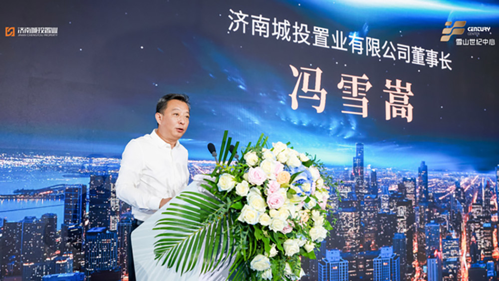 濟南城投置業董事長馮雪嵩登臺致歡迎辭,濟南城投置業自2016年以來,依托城投集團的資源優勢,從濟南中央商務區、奧體片區、雪山片區到濟鋼片區,先后打造了逸家大廈、城投大廈、中歐校友產業大廈及環貿中心等地標產品,逐步形成了房地產開發業務多元化發展的格局。