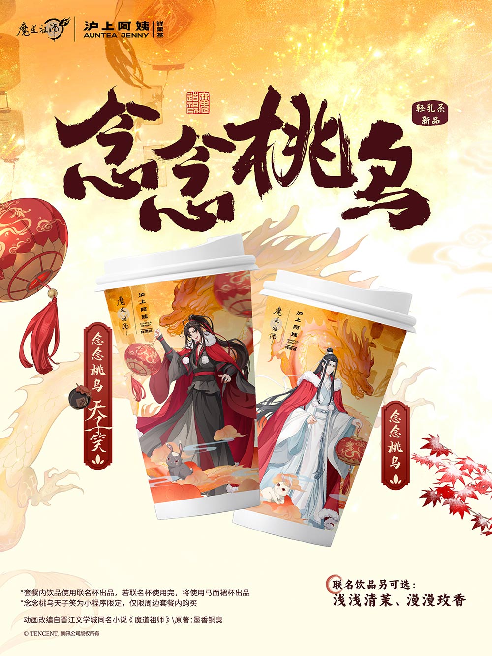 滬上阿姨與《魔道祖師》的聯(lián)名以輕乳茶為主要產(chǎn)品,取名為“念念桃烏”,“念念桃烏” 是一款不含酒精卻有白酒風(fēng)味的飲品,對應(yīng)聯(lián)名IP劇情中的“天子笑”元素。品牌準(zhǔn)備了設(shè)計精美的龍年主題聯(lián)名杯子,將魏無羨和藍(lán)忘機(jī)的形象印在了同一款聯(lián)名產(chǎn)品的AB面上,使其更貼合聯(lián)名主題。