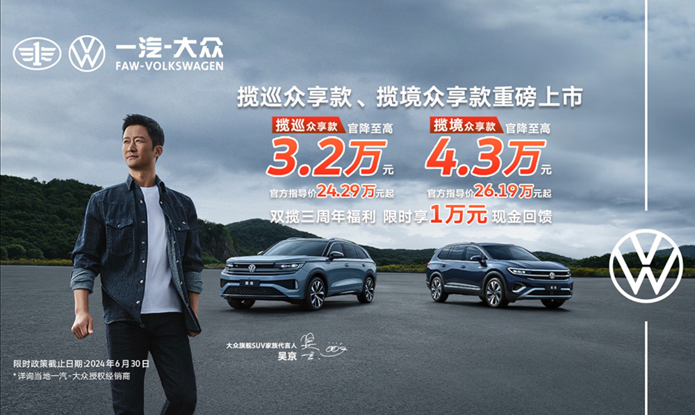 2024年6月一汽-大眾攬境上市三周年之際,為回饋廣大用戶的支持與期待,大眾旗艦SUV家族攬境、攬巡聯袂推出眾享款車型,指導價全系官降至高可達4.3萬元,并加享限時1萬元現金回饋。此外,現在試駕購車還額外可享至高2.3萬元置換補貼(含國補)、藍牙數字鑰匙并有機會抽取阿勒泰試駕活動的名額。