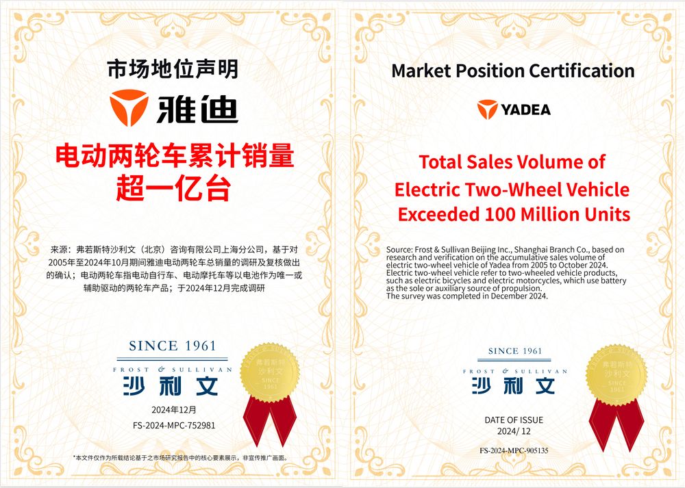 “恭喜雅迪,全球累計銷量突破1億臺!”當全球著名市場咨詢機構弗若斯特沙利文代表將全球銷量市場地位確認證書交給雅迪的那一刻,全場響起雷鳴般的掌聲,來自國內、歐洲、北美、南美、非洲、東南亞、中亞等全球多個區域的雅迪經銷商代表們齊聚一堂,共同見證了這一里程碑時刻。
