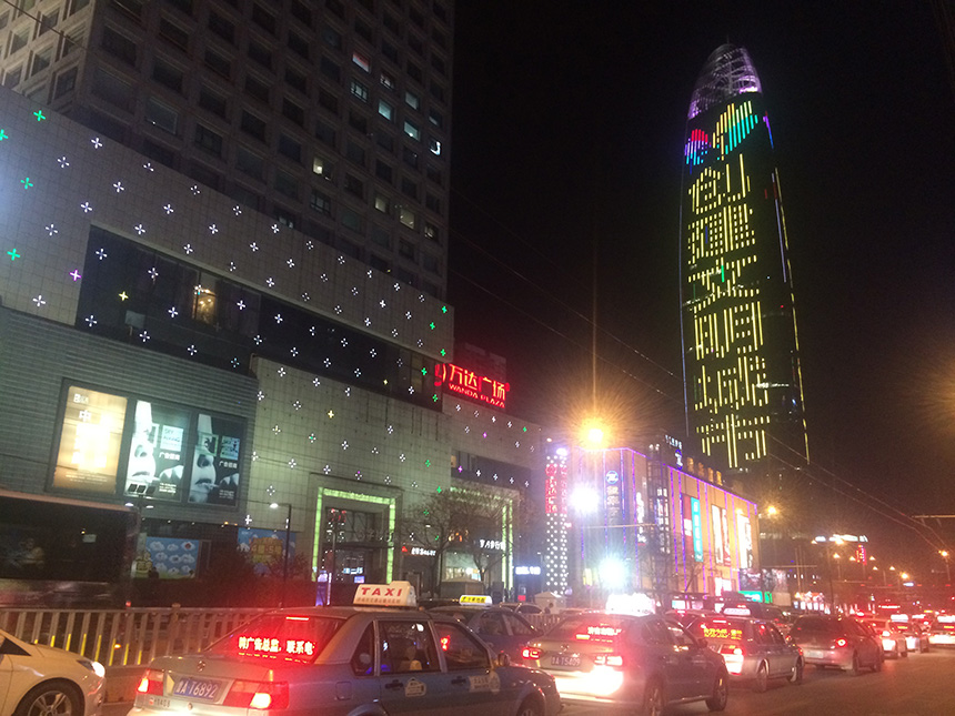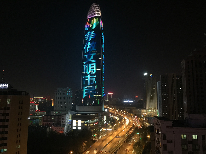 華燈初上的濟南,霓虹閃爍。綠地大高樓利用體自身高度及影響力,通過變換的屏幕和燈光顏色打出了“創建文明城市 爭做文明市民 濟南市文明辦”三屏宣傳標語和創建文明城市標識,照亮了車水馬龍的城市上空,與其他建筑的燈光交相輝映,相得益彰。