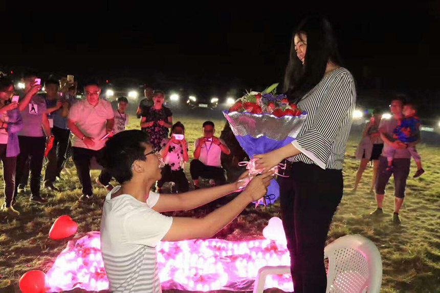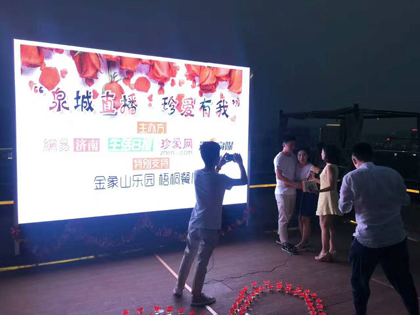那一刻終于來了。5月20日晚上7點15分,泉城路77號19樓梧桐餐廳的露天餐廳里,火紅色的玫瑰花瓣鋪成心形,西側的泉城第一高——綠地高媒外墻輪番滾動著他們愛的宣言,“游雪倩,你在時你是一切,你不在時一切是你。”