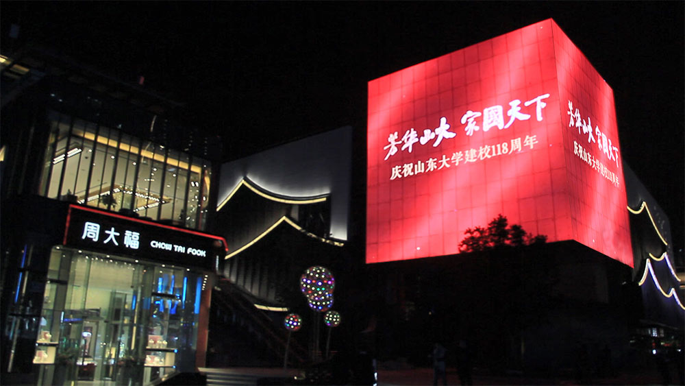 (山東大學投放是“魔方”山東國際時尚創意中心戶外LED屏廣告)