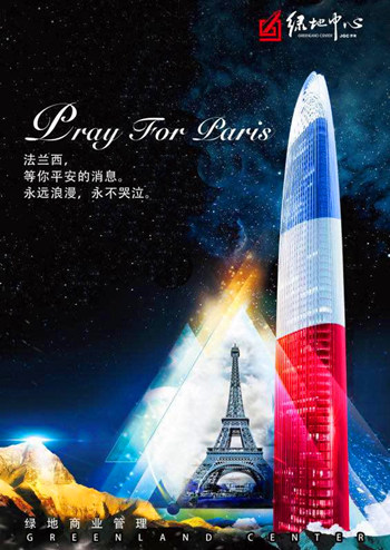 今晚,濟南綠地高媒”泉城之根“綠地中心作為泉城地標也將將亮起“法蘭西之色”,用泉城人民的大愛為浪漫之都巴黎祈福,愿她永不哭泣,永遠浪漫,愿世界永遠和平!