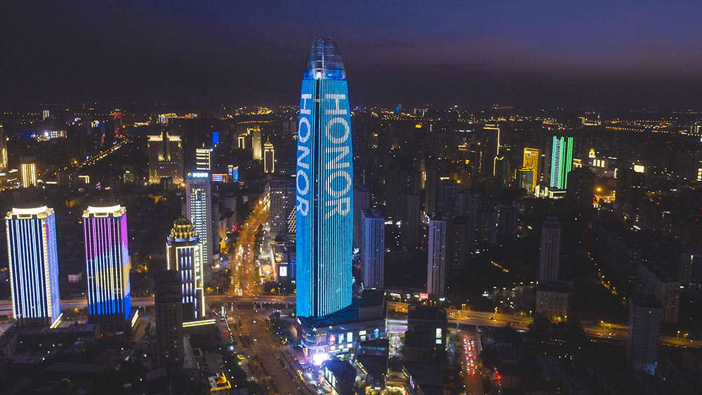 為了更好的烘托活動(dòng)效果,榮耀手機(jī)攜手山東華途文化傳媒有限公司,登頂濟(jì)南地標(biāo)媒體用酷炫的燈光秀告訴泉城人民,在今夜在此時(shí)榮耀X10走向我們。