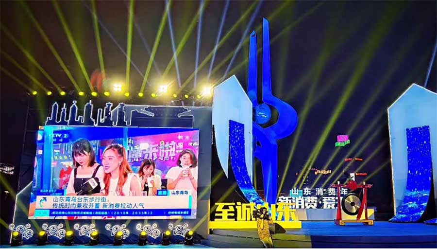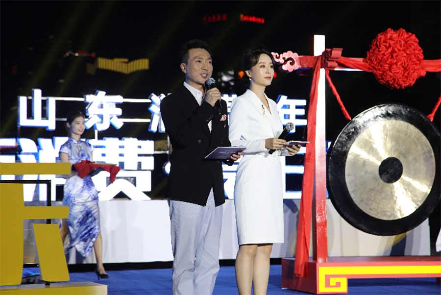 當(dāng)天的系列活動亮點紛呈。在啟動儀式上,通過中央廣播電視總臺的大屏,現(xiàn)場連線了青島臺東步行街、棗莊臺兒莊古城、煙臺祥隆上市里、青州古街、威海韓樂坊夜市等山東省內(nèi)熱點消費區(qū)域,同步觀看各地活動盛況。