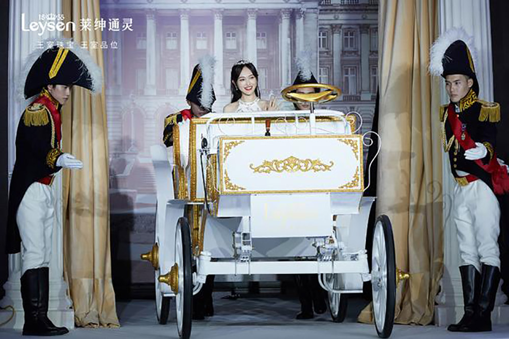 Leysen萊紳通靈真愛官唐嫣身著精致禮服,頭戴古董王冠,佩戴王室莊園系列珠寶,乘坐王室馬車,在騎士的護送下驚艷亮相。并與恒隆廣場董事、總經理、Leysen萊紳通靈首席增長官,首席營銷官等共同揭幕王室莊園系列、王室克拉鉆定制全新產品上市,見證閃耀時刻,粉絲們歡呼聲一片,瞬間將氣氛推向高潮。